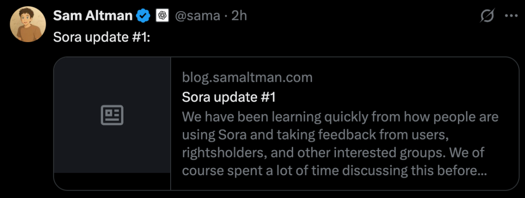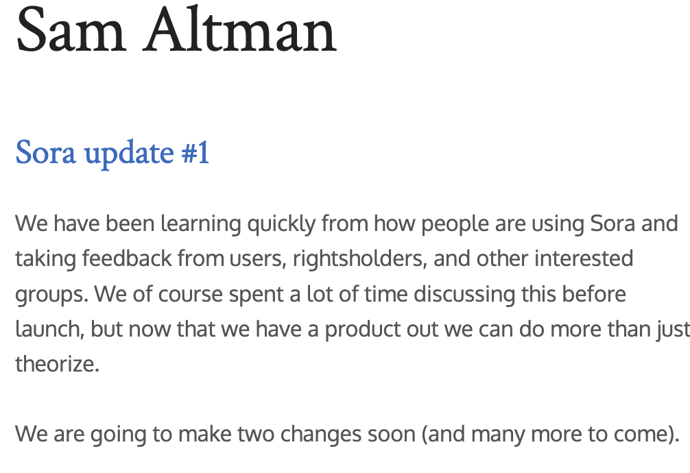 值得一提的是,奥特曼今早发博文预告,Sora下一次两大更新: