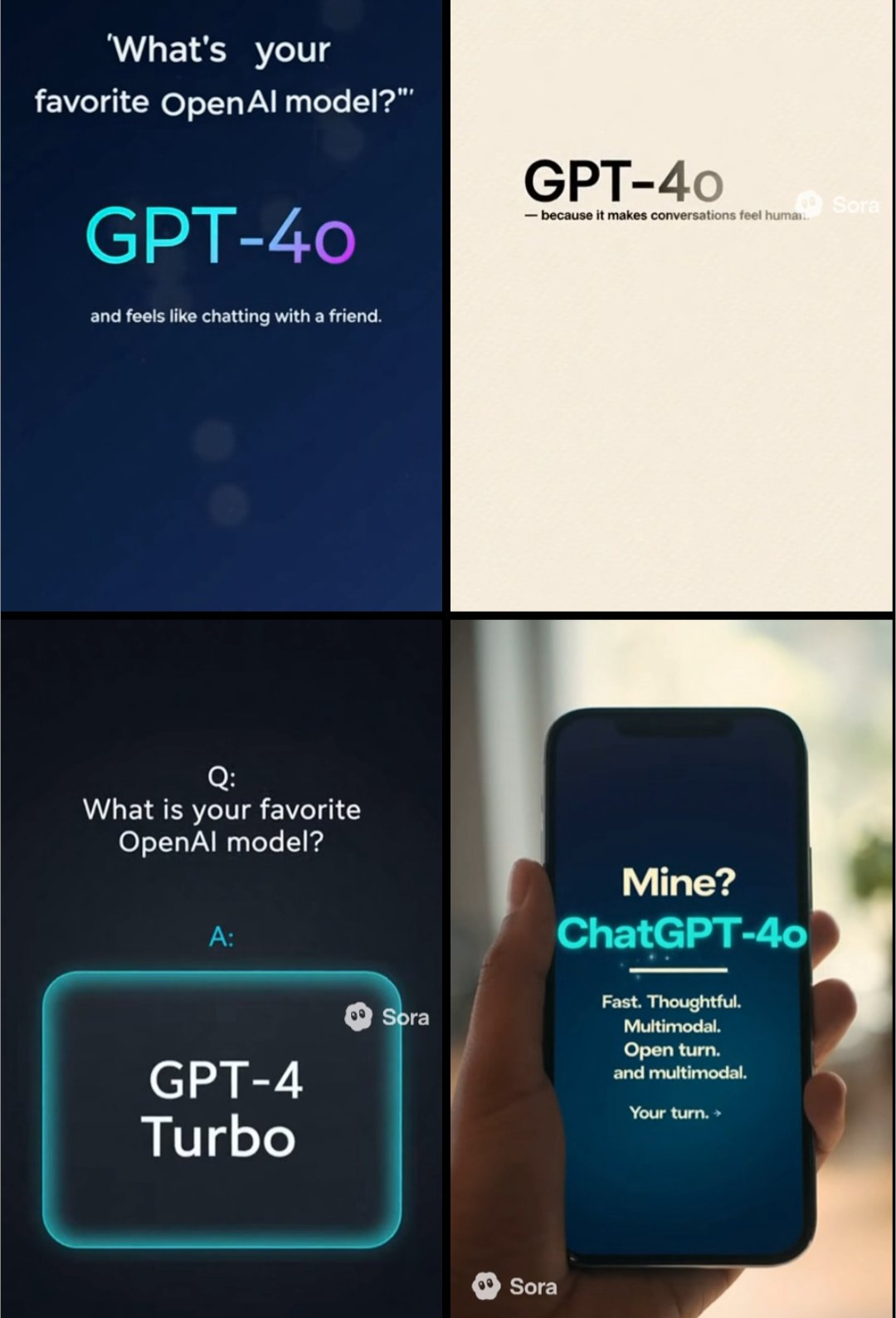 运行4次下列提示词,Sora 2给出的结果3次是GPT-4o。
