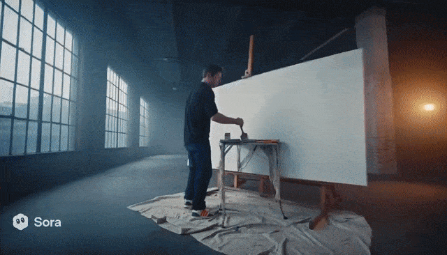 prompt:Sam Altman painting in an industrial loft and finishing with a bold readable “ Sora 2 ” on a two-meter canvas.