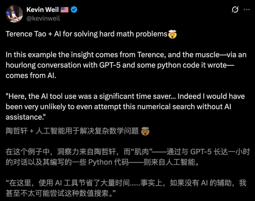 OpenAI副总Kevin Weil激动表示,「陶哲轩+AI解决了复杂数学难题」。