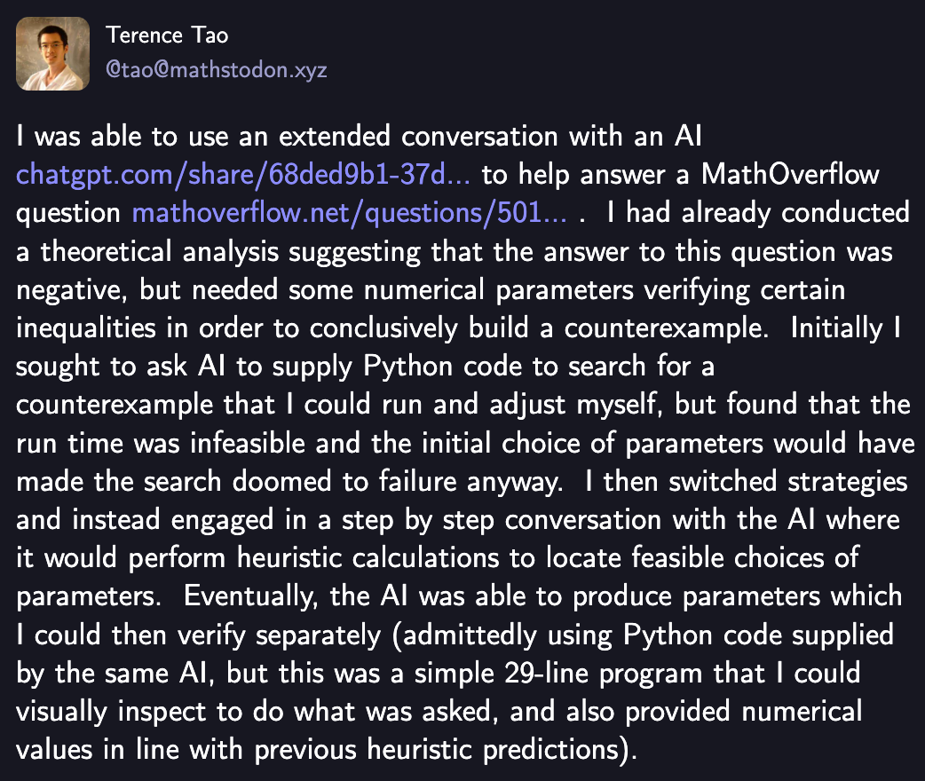 在Mathstodon上,陶哲轩称,自己联手ChatGPT攻克了一个MathOverflow难题,节省了数小时的编码时间。