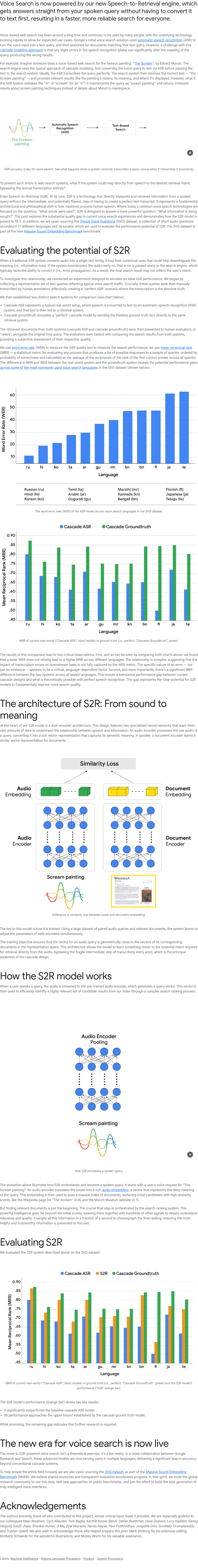 谷歌推出新的语音搜索技术——Speech-to-Retrieval引擎,直接从语音中检索信息,无需先转为文本,提升搜索速度与准确性。传统语音搜索依赖自动语音识别(ASR)将语音转为文字再进行查询,但ASR的微小错误可能导致语义偏差,影响结果相关性。例如,搜索“《呐喊》”时,若ASR误识别为“尖叫”,则返回结果可能偏离原意。新模型跳过文本转换环节,实现端到端语音到结果的检索,减少误差累积,增强鲁棒性。该技术标志着语音搜索从级联模型向一体化检索的演进,提升用户体验,支持更广泛的应用场景,尤其在复杂或模糊发音下表现更优,推动语音交互向更自然、高效方向发展。