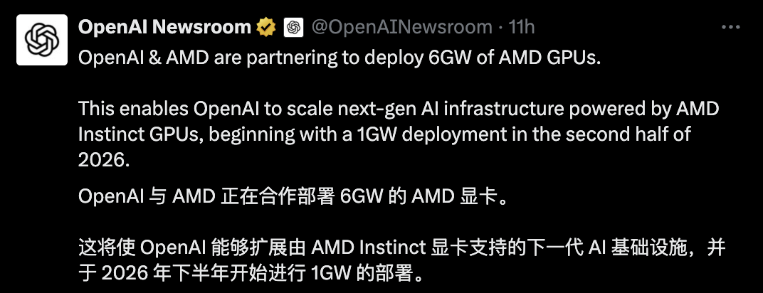 前者承诺未来数年要部署总计6GW的AMD GPU算力,首批1GW在2026年下半年开始部署。