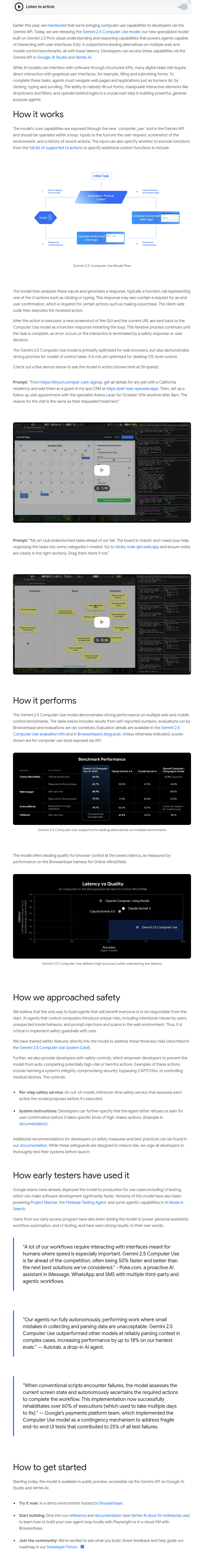 Gemini 2.5 Computer Use模型现已发布,基于Gemini 2.5 Pro的视觉理解与推理能力,专为操作用户界面而设计。该模型在多项网页与移动控制基准测试中表现优于现有方案,且延迟更低,可实现点击、输入、滚动等类人操作,支持表单填写、下拉菜单控制及登录后操作。开发者可通过Google AI Studio和Vertex AI的Gemini API调用此功能,使AI代理能直接与图形界面交互,完成需UI操作的复杂数字任务,弥补了传统API接入的局限,提升自动化能力。