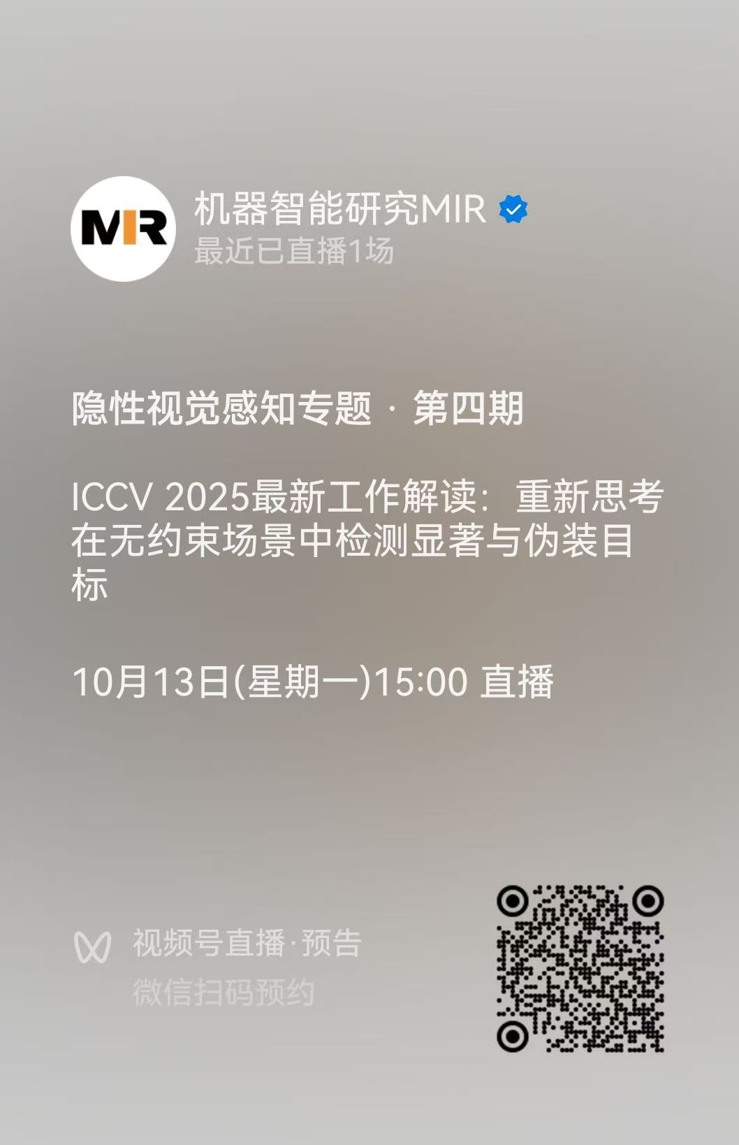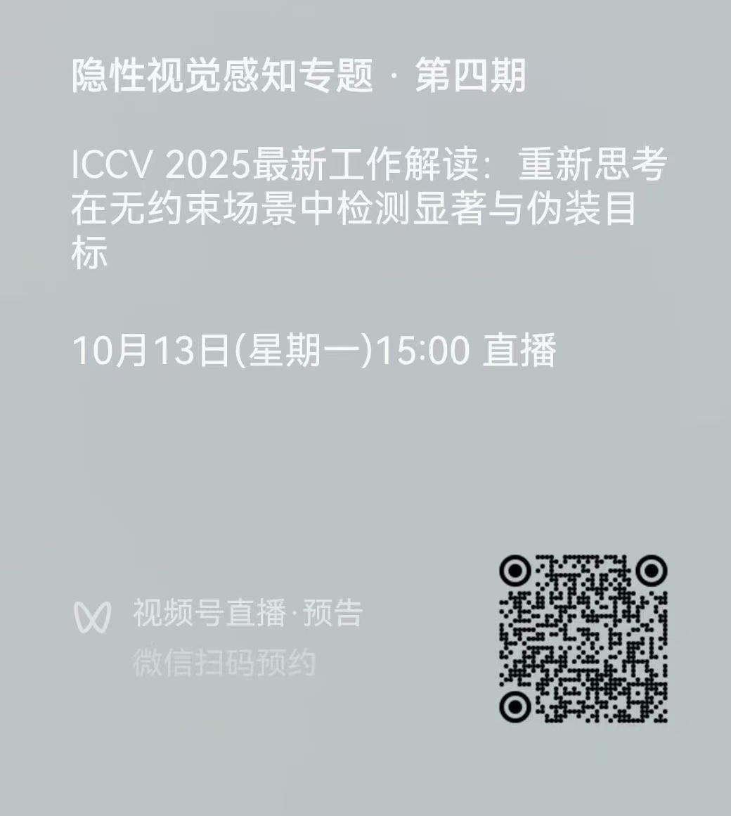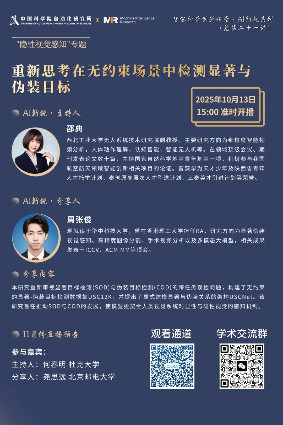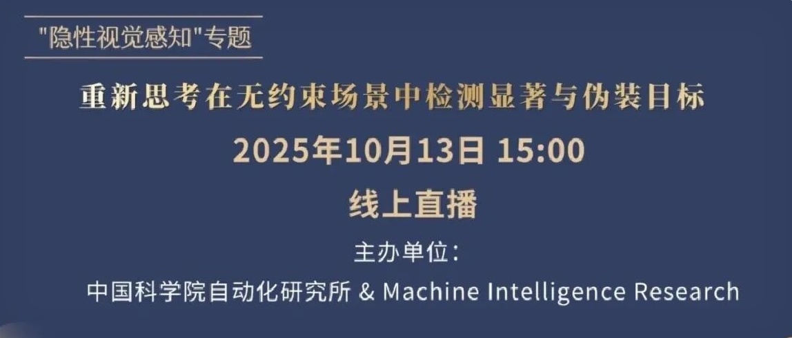 智能科学创新讲堂本期聚焦"隐性视觉感知"专题。"隐性视觉感知"专题专注于伪装目标检测、透明物体分割、阴影检测等隐性视觉感知前沿研究,并积极探索其在医疗影像(如息肉检测)等领域的应用拓展。旨在让这个重要而富有挑战性的研究主题更加活跃,通过开放的学术交流不断迸发新的思想火花,推动学术社区繁荣和领域持续进步,促进计算机视觉与医疗影像等交叉领域的深入交流与合作,逐步打通不同应用场景的技术壁垒。