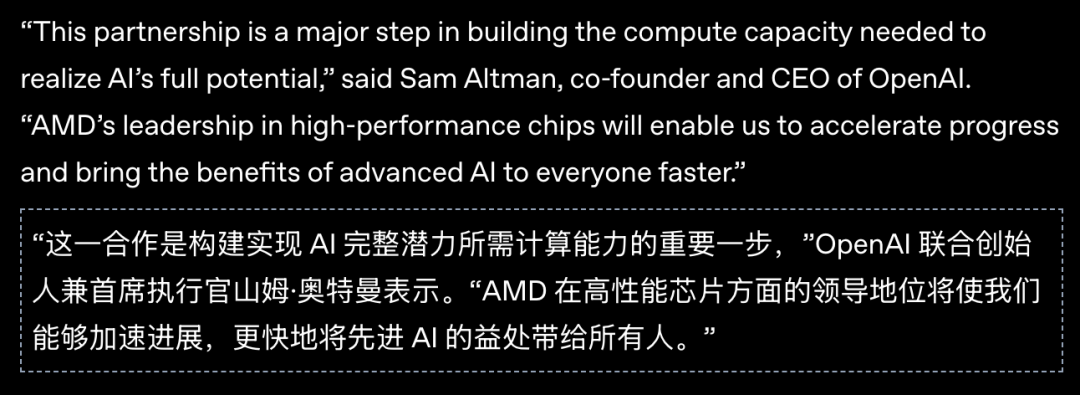 OpenAI的总裁Greg Brockman则表示:「构建AI的未来需要在技术栈的每一层进行深度协作,与AMD并肩合作将能够扩展规模,提供惠及全球的AI工具」。
