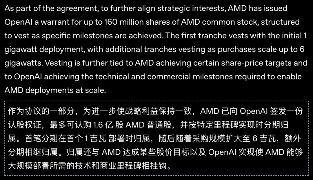 并且作为协议的一部分,OpenAI将最多可认购1.6亿股AMD普通股。