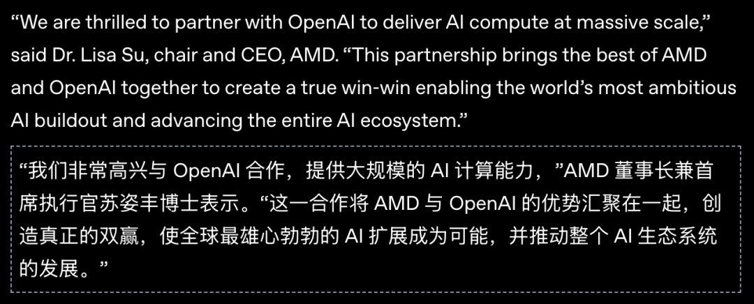 AMD的董事长兼CEO苏姿丰表示:「这一合作将AMD和OpenAI的优势汇聚在一起,创造真正的双赢,推动整个AI生态系统的发展」。