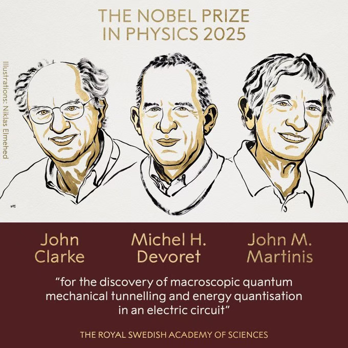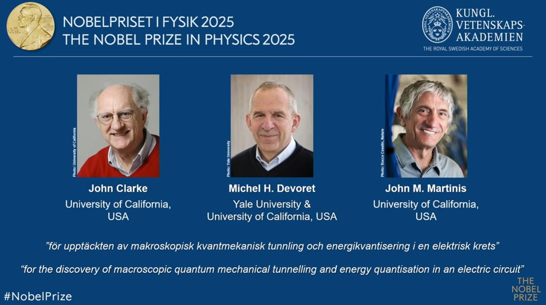 科学家John Clarke、Michel H. Devoret和John M. Martinis三人获奖,以表彰他们「发现电路中的宏观量子力学隧道效应和能量量子化」。