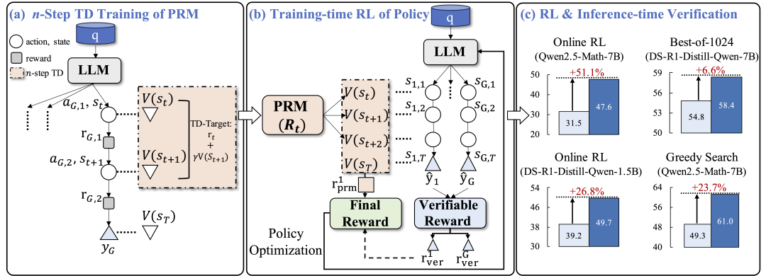 TD-λ:相比于 n 步时间差分,TD-λ 是一种具有更高灵活性的在线算法。由于其在线特性,TD-λ 允许过程奖励模型在观察到奖励后立即将信息传播到更早的状态。