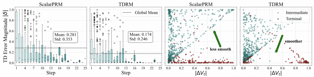 平滑性是推理过程中有效奖励建模的一个重要特性,因为其反映了中间步骤中价值更新的一致性和稳定性,确保推理轨迹的微小变化不会导致价值估计的不成比例的偏差。为评估平滑性,团队采用两种互补方法来对比 ScalarPRM 和 TDRM 的表现。