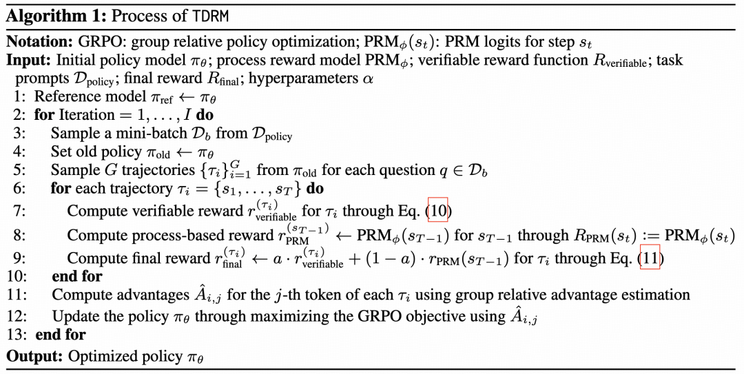 在 TDRM 中,通过线性组合的方式将可验证奖励和基于过程的奖励相结合,以发挥两者的互补优势。这一组合后的奖励信号被用于训练 GRPO 目标函数,从而提升了学习过程的整体性能和数据效率。