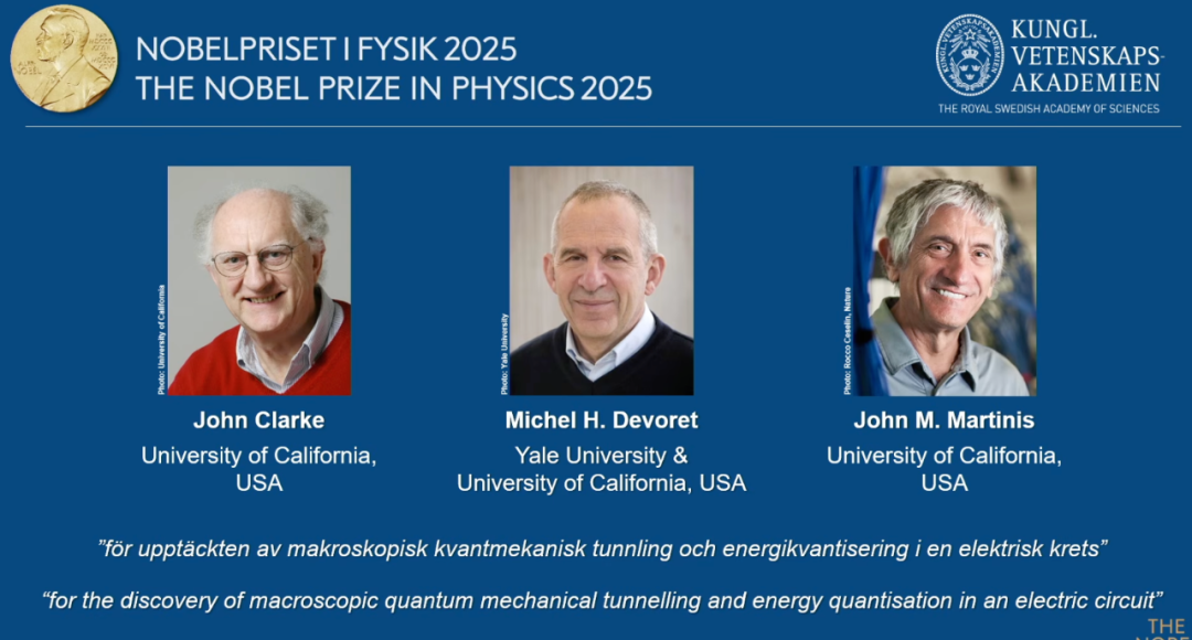 今年颁给了量子力学领域的三位科学家John Clarke、Michel H. Devoret和John M. Martinis,以表彰他们: