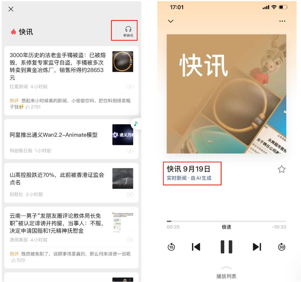 平时有阅读公众号习惯的朋友们,前段时间可能已经注意到,微信上线了一个全新的功能——「快讯」。在这一板块中,用户不仅能阅读每日资讯,还能收听一档由男女两位主播以对谈形式带来的快讯播客,涵盖热点速递、国际新闻等多个环节。更有趣的点在于,播客标题的下方明确标注了「由 AI 生成」的相关字眼,这正是微信在进行的 AI 播客灰度测试。这一动作与腾讯混元在 8 月 5 日正式推出 AI 播客功能的消息,以及 9 月 16 日-17 日腾讯云智慧传媒,在腾讯全球数字生态大会上公开展示的「AI 快讯+AI 播客」行业解决方案可谓相呼应。