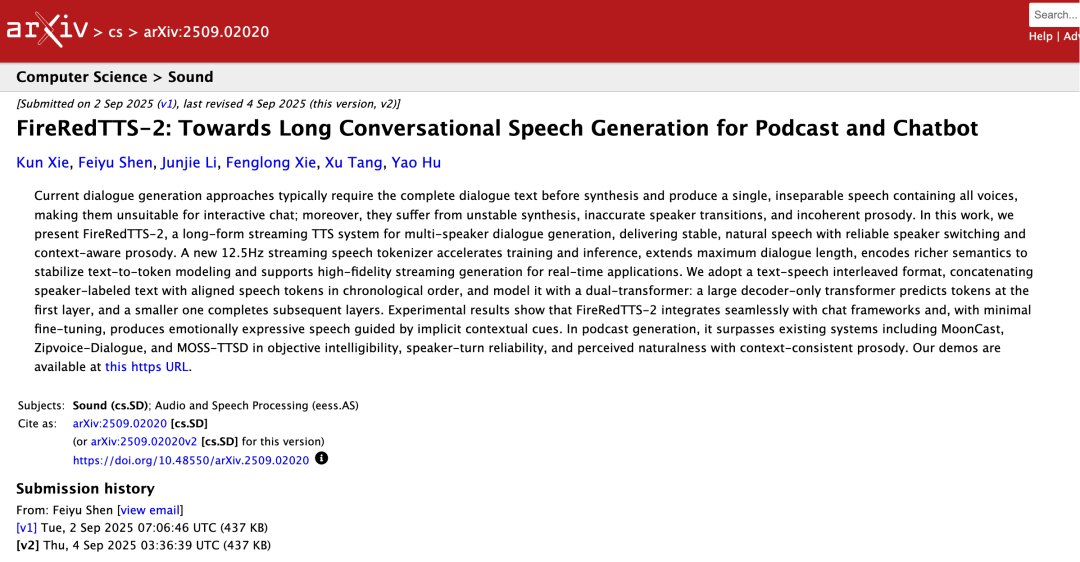 一方面,大厂玩家的加入无疑为 AI 播客赛道添了一把猛火,迅速推高了领域内的关注度。其中最早出圈的产品莫过于 Google 的 NoteBookLM,以高度总结性的音频概览见长,旨在帮助用户快速消化资料,其强大的音频能力也成为了 AI 播客的高效工具。近期优化后,新增支持包含中文在内的 50 多种语言,解决了先前只能使用英语的难题;字节跳动推出的豆包依托于火山引擎的大模型能力,实现一键生成播客内容,端到端的语言对话,可以理解为「边听边理解边回答」,其自然度和质感算得上中文 AI 播客里的第一梯队;除此之外,小红书音频团队也在前不久带来了对话生成模型 FireRedTTS-2,相关论文以「FireRedTTS-2: Towards Long Conversational Speech Generation for Podcast and Chatbot」为题发表于 arXiv。