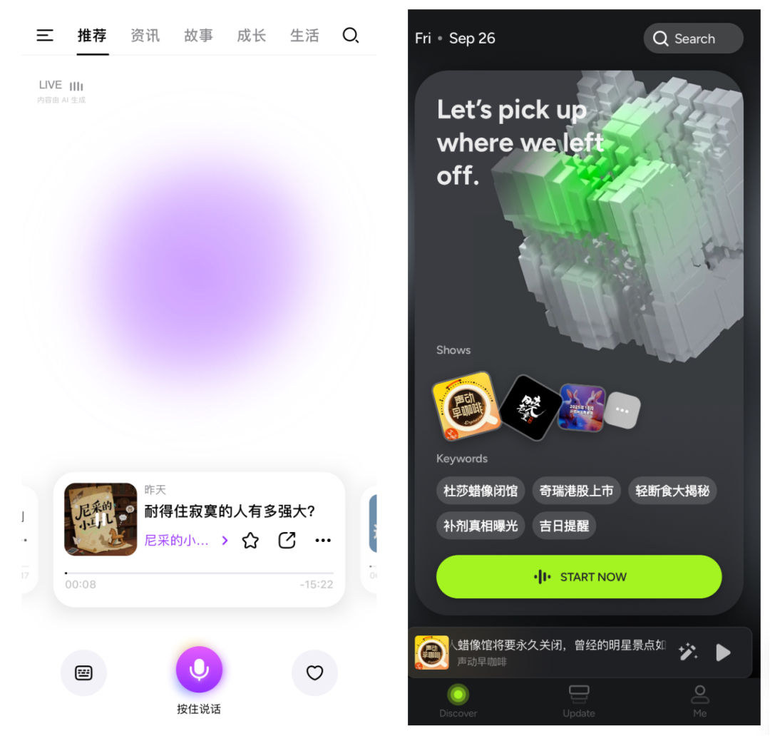 在应用层面,上述提到的技术已经逐步走进大众视野。当前市面上的 AI 播客产品,按照背景可以划分为两大阵营: