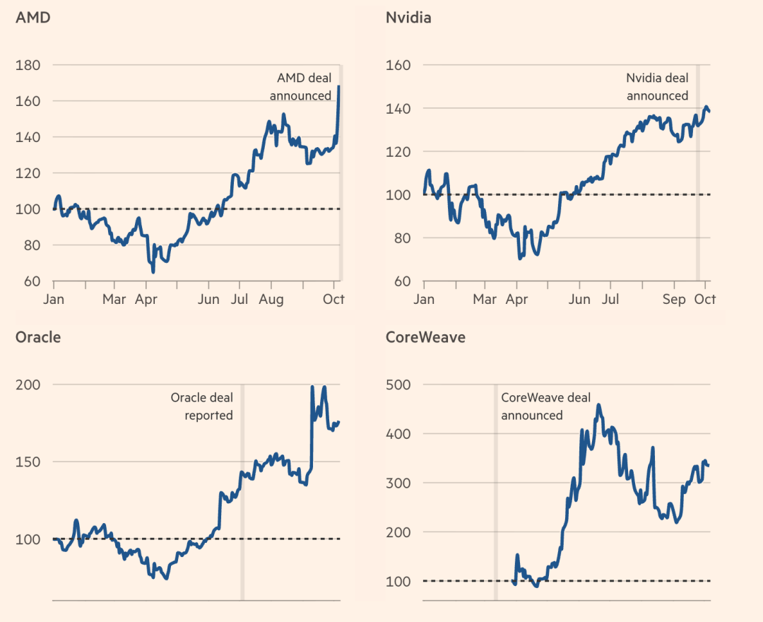 上月与OpenAI的交易公布后,甲骨文的市值一夜飙升2440亿美元;本周一,AMD的股价大涨近24%,市值增加了630亿美元。