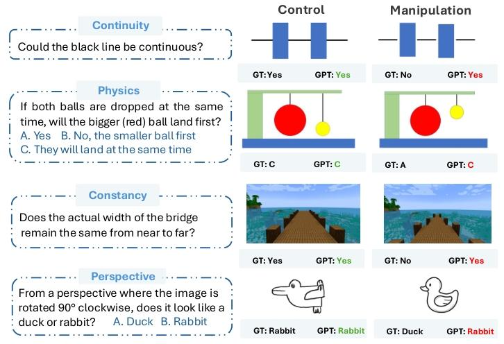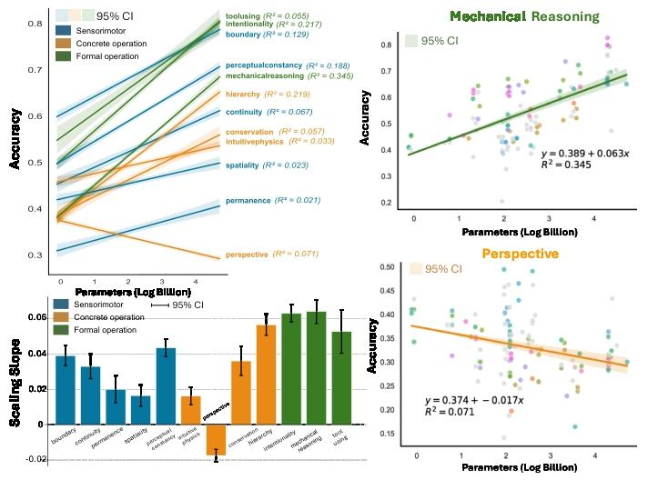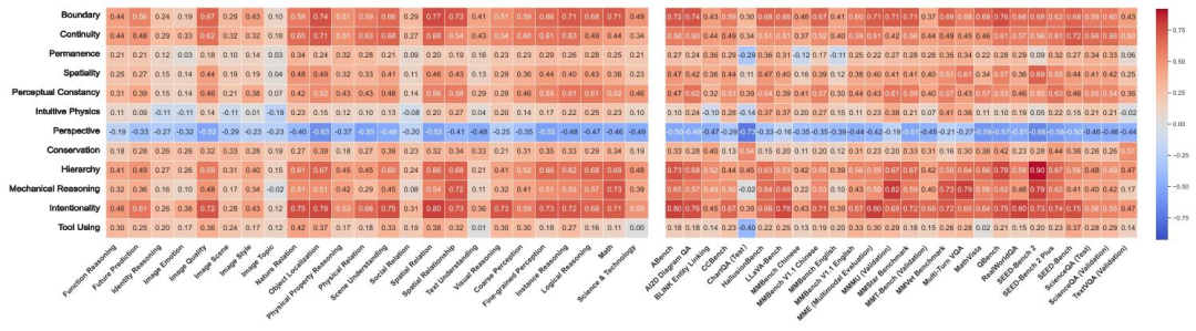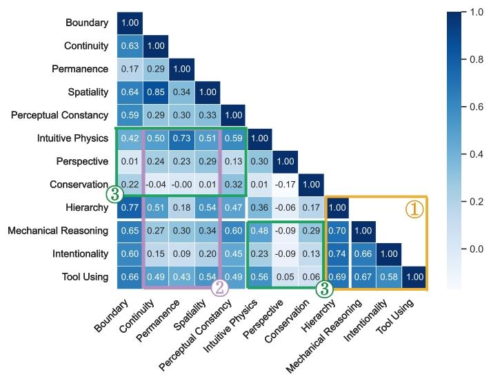 研究者建了测评题库CoreCognition,覆盖在人类婴幼儿阶段即出现的12种核心认知能力(如客体永恒、视角采择、直觉物理、知觉恒常等),用来对模型进行系统性测试。