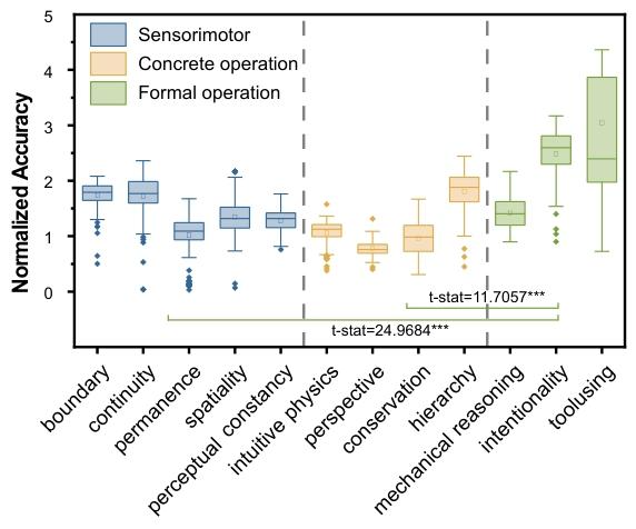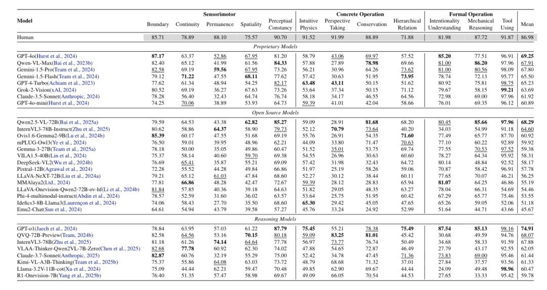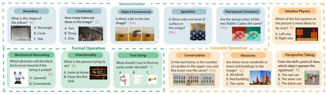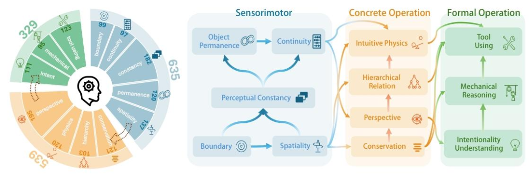 基准围绕发展心理学与皮亚杰分层框架,覆盖从连续性到机械推理12 项核心认知概念,共1503道多模态题目,每类≥95例,含图像与视频。