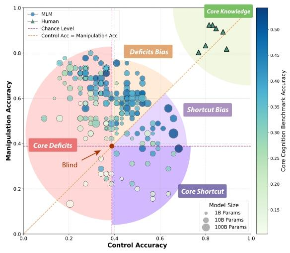 在CoreCognition基准的1503道“经典发展心理学测验”上,230个主流模型系统暴露出对世界常识的“核心知识盲区”。
