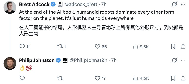 美国初创公司Starcloud联合创始人兼CEO Philip Johnston转发了Figure 03的表现并直言,“除人形机器人外,其他任何形态的机器人都将被淘汰”: