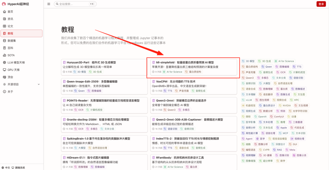 「Ml-simplefold:轻量级蛋白质折叠预测 AI 模型」现已上线 HyperAI超神经官网(hyper.ai)的「教程」板块,一键运行即可体验最新的蛋白质生成工具~