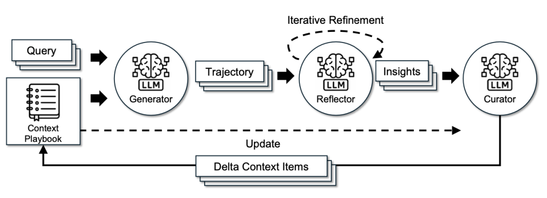 生成器(Generator):负责生成推理轨迹; 反思器(Reflector):负责从成功和错误中提炼具体见解; 整理器(Curator):负责将这些见解整合到结构化的上下文更新中。
