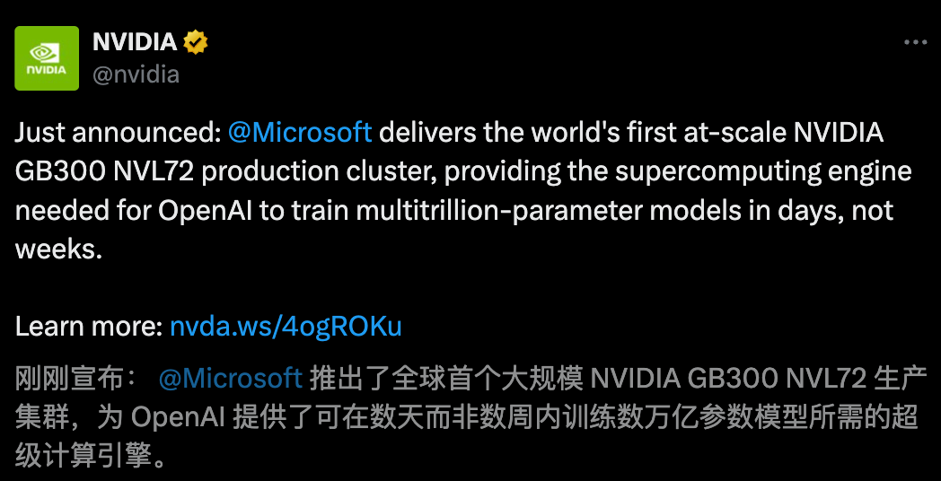 纳德拉官宣,全球首个配备4600+ GB300的超算率先上线,专攻OpenAI。预计,未来将扩展到十万块GPU。