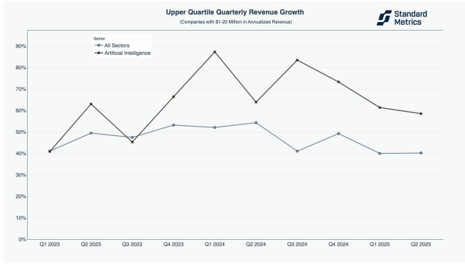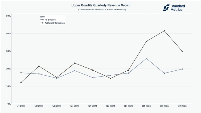Standard Metrics 的数据指出,AI 公司的增长势头不仅限于初创阶段,在增长阶段同样也表现出色。无论是年收入处于 100 万至 2000 万美元区间的成长型 AI 公司,还是年收入超过 2000 万美元的成熟型 AI 公司,其增长表现自 2023 年第三季度以来均持续优于所有行业的平均水平。在上个季度,年收入在 100 万至 2000 万美元的 AI 公司季度收入增长率为 60%,而年收入超过 2000 万美元的 AI 公司增长率为 30%,两者的增长率均为行业平均水平的 1.5 倍。