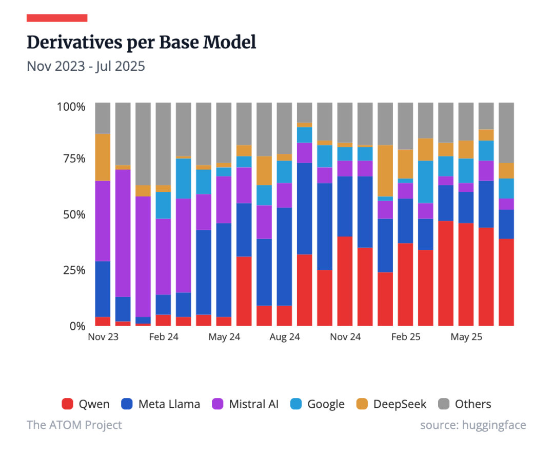 2024 年初,中国模型在 Hugging Face 上的新微调模型中仅占 10% 到 30%。而现在,仅 Qwen 一个模型就占了每月新衍生模型的 40% 以上,而 Llama 的份额则从 2024 年末的约 50% 下降到仅 15%。曾经被视为「Llama 仿制品」的 Qwen,现在正成为越来越多全球开发者的构建基础。