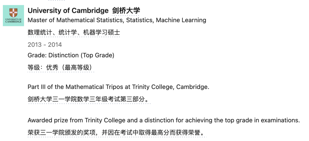 再然后又于2013-2014年攻读了剑桥大学的数理统计、统计学与机器学习硕士,表现优异,荣获三一学院颁发的奖项,并因在考试中取得最高分而获得荣誉。