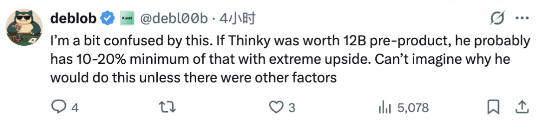 但对于Tulloch的离职,还是有网友感到不解,表示如果Thinking Machines Lab估值是120亿美元,Tulloch起码能拿到10%,实在是想象不到他的离职理由。