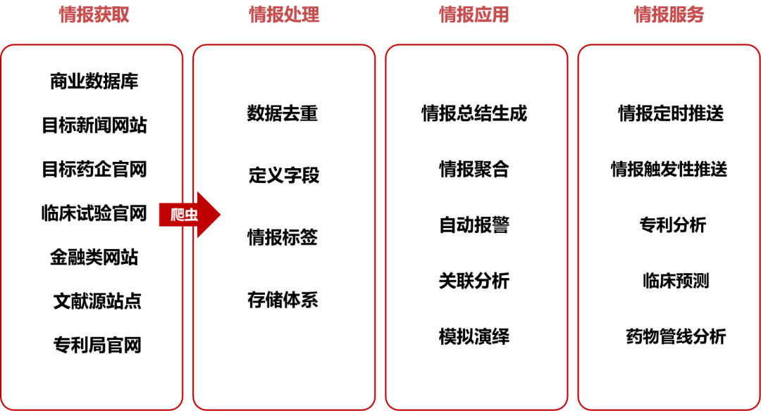 情报聚合:对从不同渠道采集到的情报数据,支持根据同一主体(药企、药物、疾病领域、靶点等)进行信息整合。