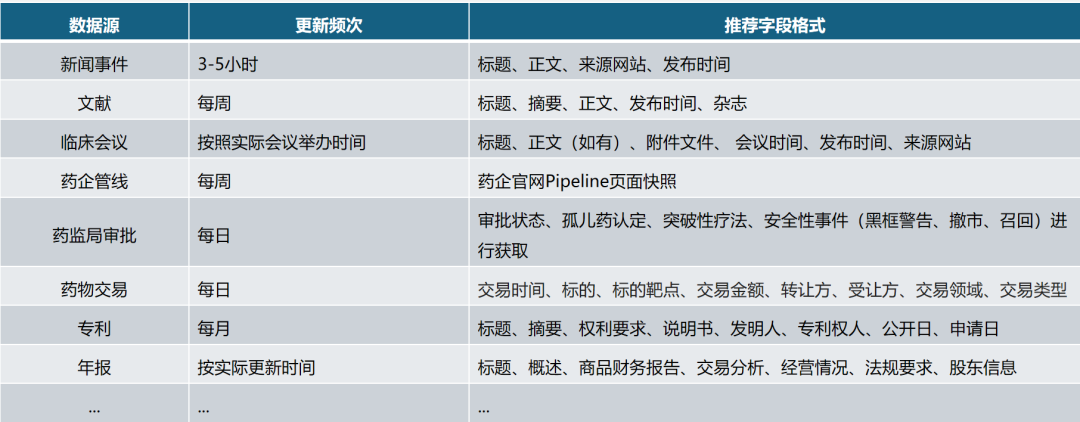 按照需求的描述变成统一类型的文本,这个都不难理解。但是对各类数据类型统一就需要我们来做解决方案了。比如药企客户要求的如文献的标题、作者、发表时间等,资讯的标题、发布来源、发布时间等。但是新闻、专利、临床如何整理出相应字段呢?这里药企说要给出模版,其实都是需要供应商帮助梳理。这部分我放到解决方案中讲。