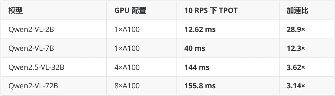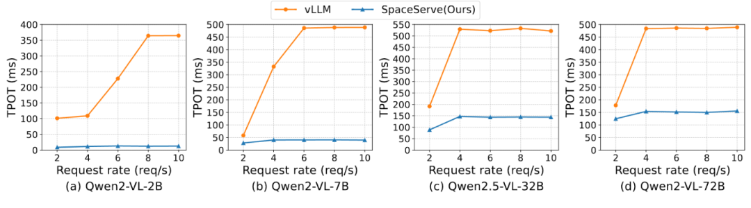 在Qwen2-VL系列模型(2B–72B)上,SpaceServe显著优于vLLMv1:
