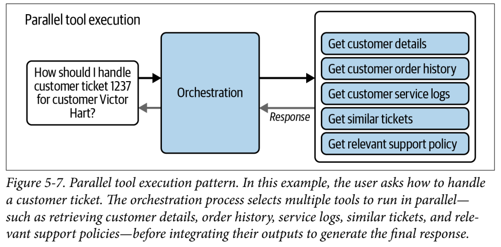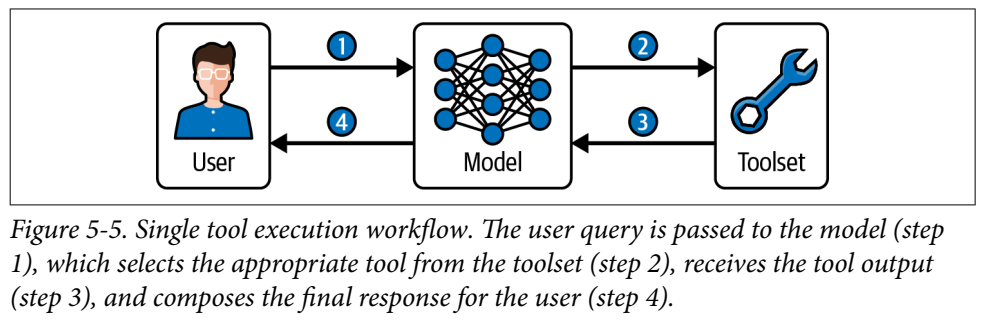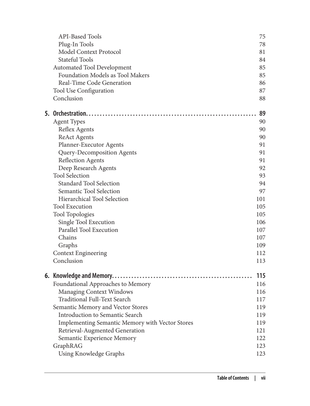 第5章介绍编排,包括基础知识(参数化、工具选择、执行)、工具选择方法(生成式、语义式、层次式、机器学习式)、工具拓扑(分解、单次/并行/顺序执行、链式、树式、图式)和规划策略(增量执行、零样本、少样本、ReAct)。