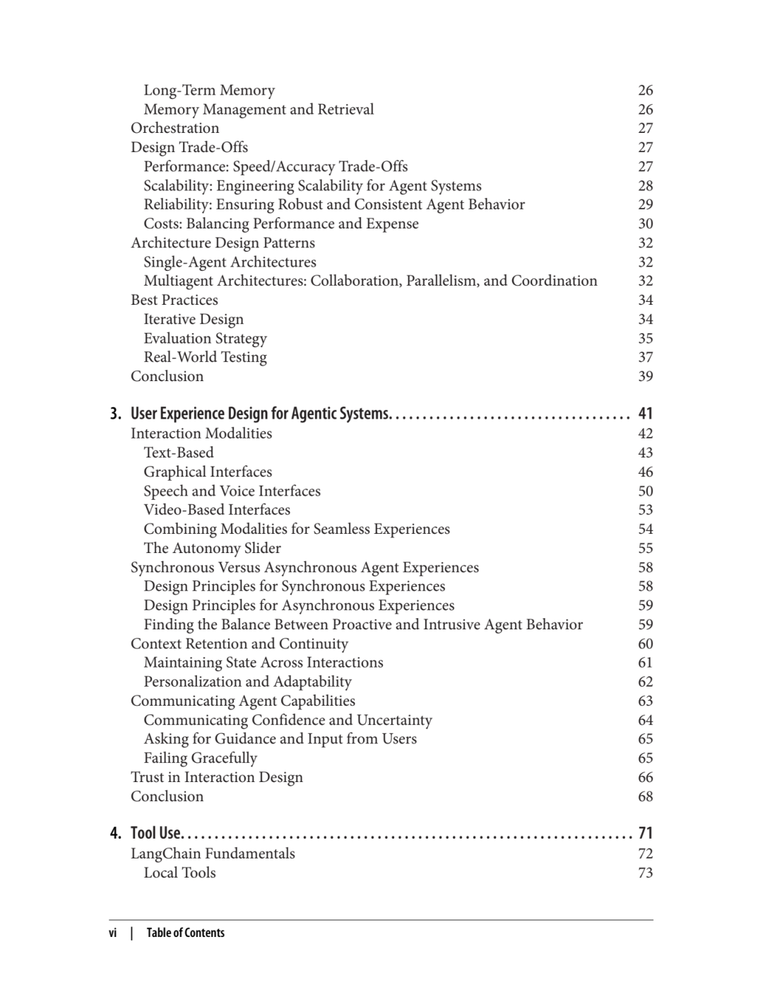 本书章节遵循构建人工智能代理应用程序的生命周期,分为三个主要部分。前三章涵盖核心概念、设计原则和基本组件: