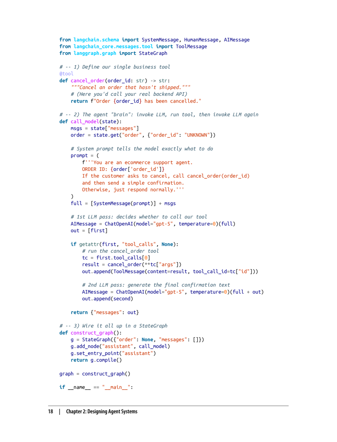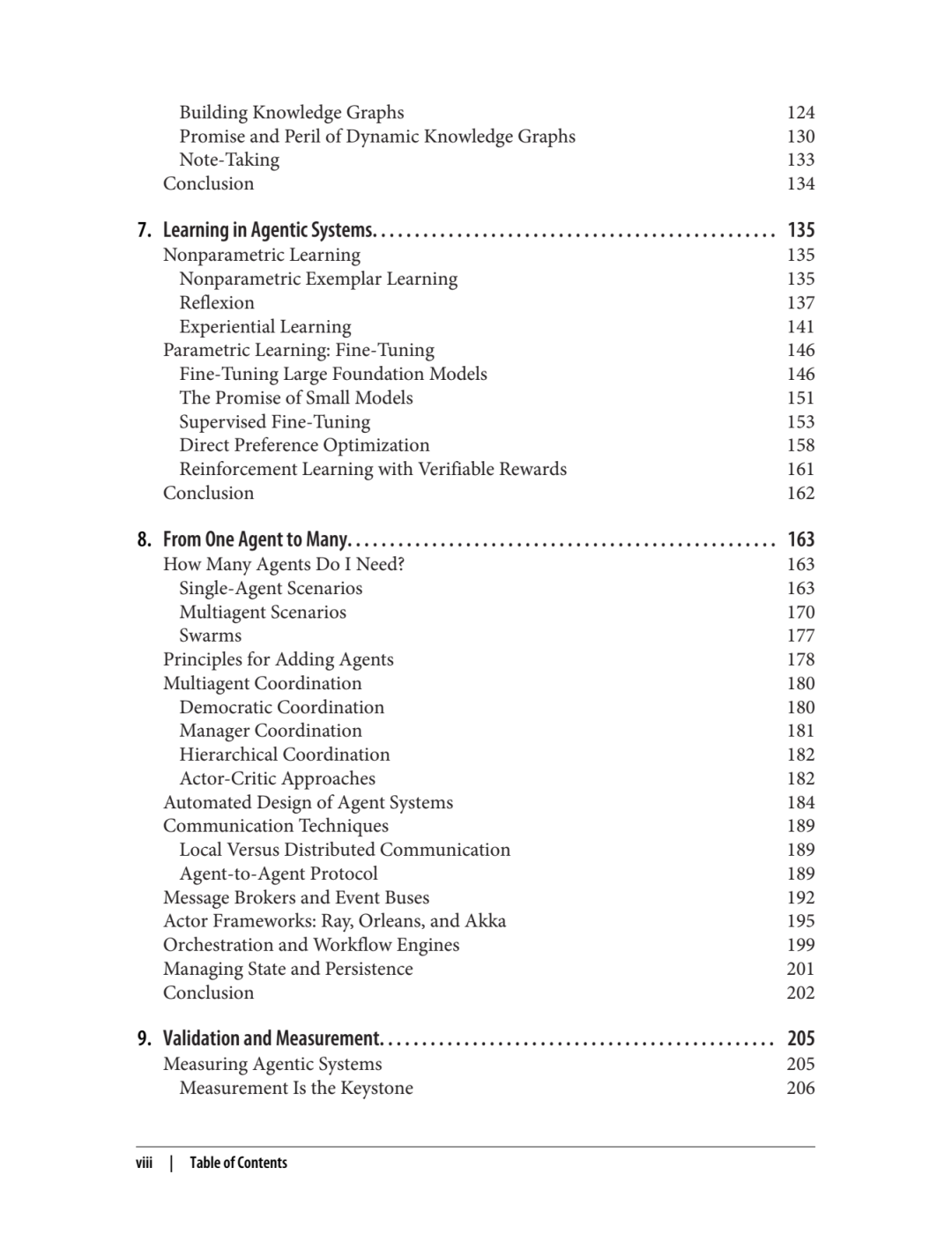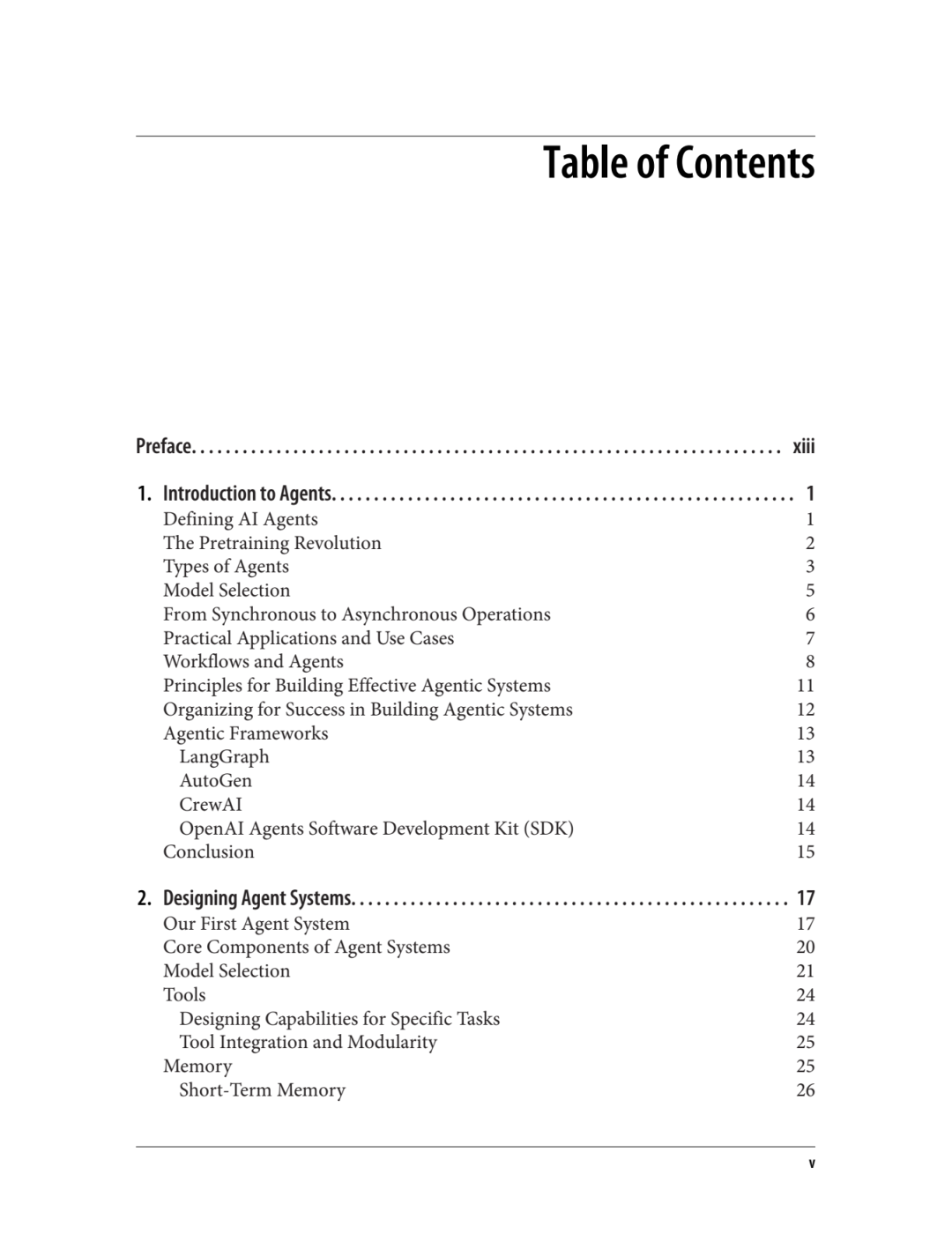 第2章概述了代理系统的设计,包括场景选择、核心组件(模型选择、工具、内存、规划)、设计权衡、架构模式(单代理、多代理、模块化)和最佳实践。