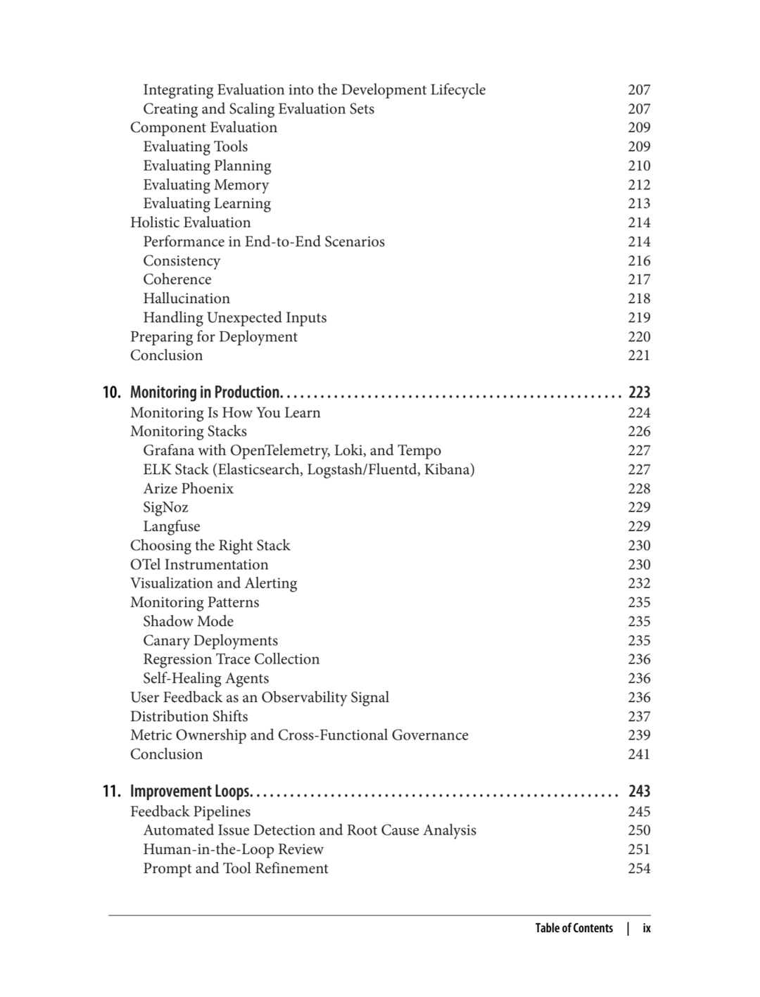 第 11 章探讨改进循环,包括反馈管道(问题检测、人工审核、改进、优先级排序)、实验(影子部署、A/B 测试、自适应、门控)和持续学习(情境学习、离线再训练、在线强化)。