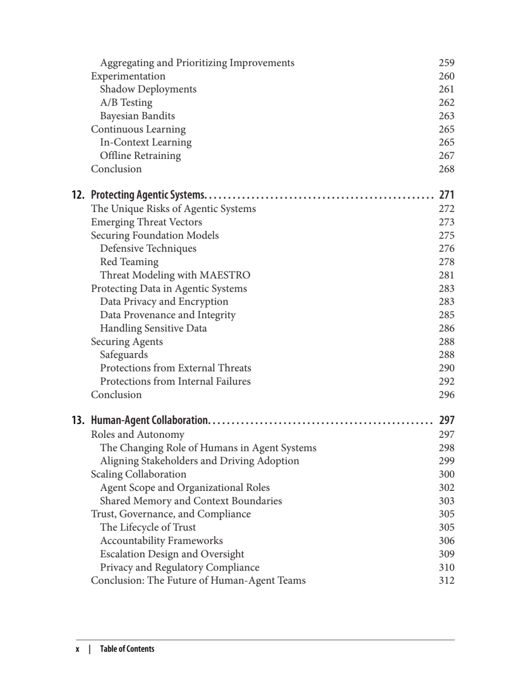第 12 章讨论保护代理系统,涵盖独特风险、保护 LLM(模型选择、防御、红队、微调)、数据保护(隐私、来源)、保护代理(安全措施、外部/内部保护)以及治理/合规性。