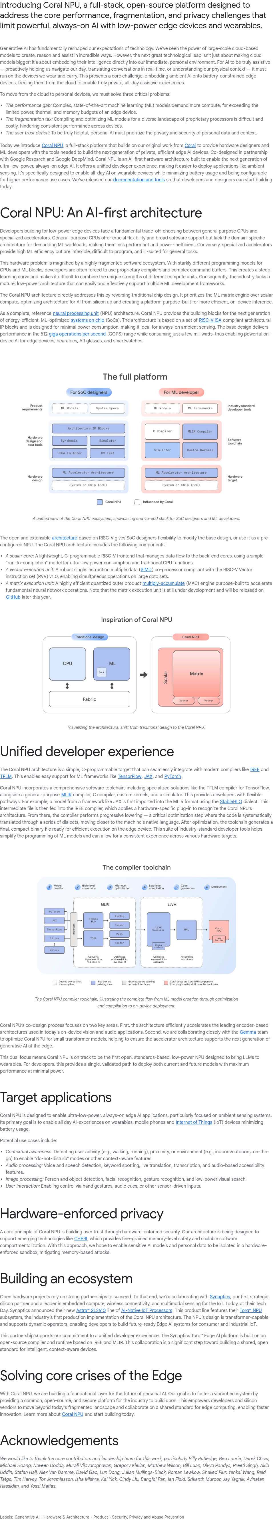Coral NPU 是一个全栈开源平台,旨在解决低功耗边缘设备和可穿戴设备在性能、碎片化和隐私方面的核心挑战,推动始终在线的AI应用。尽管生成式AI在云端展现出强大的创造力与推理能力,但下一代技术突破在于将智能嵌入个人设备中,实现真正即时、私密的辅助体验。为让AI在电池受限的设备上全天运行,必须摆脱对云的依赖。Coral NPU 通过高效能、低功耗的本地计算,支持实时翻译、情境感知等场景,推动环境智能在边缘设备上的落地,实现更自然、安全、个性化的交互。