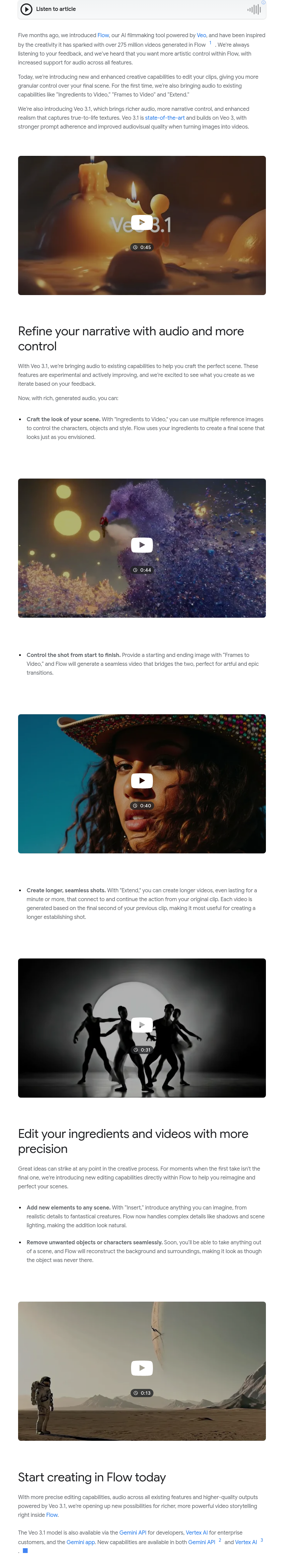 五个月前,我们推出了由Veo驱动的AI视频创作工具Flow,已生成超过2.75亿个视频,激发了广泛创意。根据用户反馈,我们今日推出全新及升级功能,增强对视频片段的精细编辑控制,并首次在“素材转视频”、“帧转视频”和“扩展视频”等功能中加入音频支持。同时发布Veo 3.1,提升音频丰富度、叙事掌控力与画面真实感,精准还原真实材质纹理。Veo 3.1在Veo 3基础上进一步优化,具备更强的提示遵循能力与更高音视频质量,显著提升图像转视频的表现效果,为用户提供更强大、灵活的创作体验。