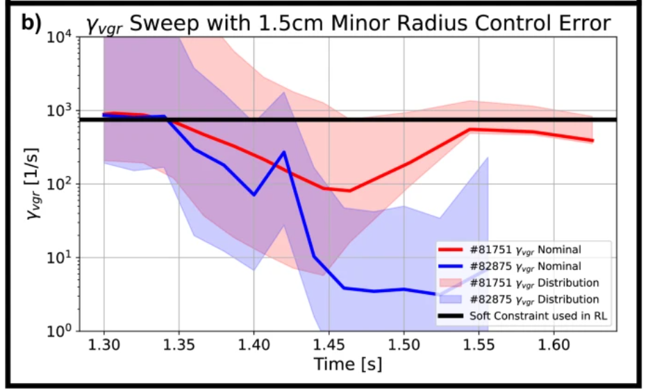 在一次编号为 #81751 的放电中,这一现象导致了等离子体的突然偏移与终止。研究团队据此在强化学习(RL)环境中引入间隙误差的不确定性分布,使轨迹在训练中主动适应不确定性。结果表明,经过重新优化的轨迹(#82875)在相似误差条件下依旧保持稳定。这一改进展示了模型从真实误差中学习鲁棒性的能力,也证明了数据驱动优化在安全约束条件下可实际提升装置运行的容错性。