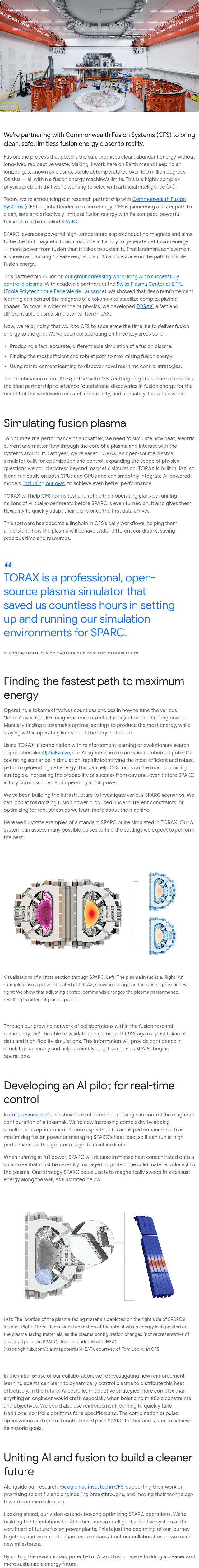 我们正与全球聚变能源领军企业Commonwealth Fusion Systems(CFS)合作,加速实现清洁、安全、无限的核聚变能源。核聚变是太阳的能量来源,具有丰富、清洁、无长期放射性废物的优势。在地球上实现聚变需在极端条件下稳定超过1亿摄氏度的等离子体,是一项极具挑战的物理难题。我们正利用人工智能(AI)技术协助解决这一复杂问题。CFS研发的紧凑型强磁场托卡马克装置SPARC,采用先进的高温超导磁体,致力于成为全球首个实现净能量增益的磁约束聚变装置,即产出的聚变能量大于输入能量,为未来商业化聚变能源铺平道路。