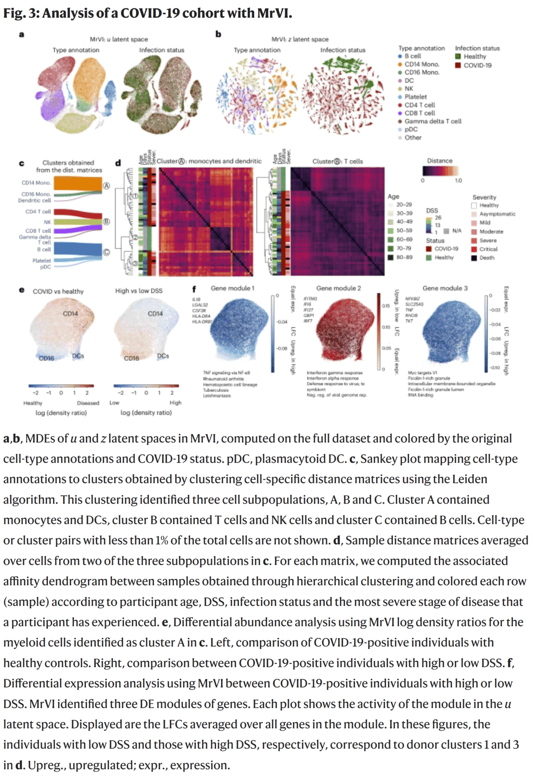 研究人员将MrVI应用于来自419,000个PBMC的COVID-19队列数据。模型在细胞类型分辨率上实现了样本整合,并揭示了单核细胞中特异性免疫反应。通过“反事实距离矩阵”,MrVI不仅区分出健康人与感染者,还进一步将感染者按症状持续时间分为两个亚群。后续分析显示,这种分群与单核细胞活化状态及感染时间高度相关。