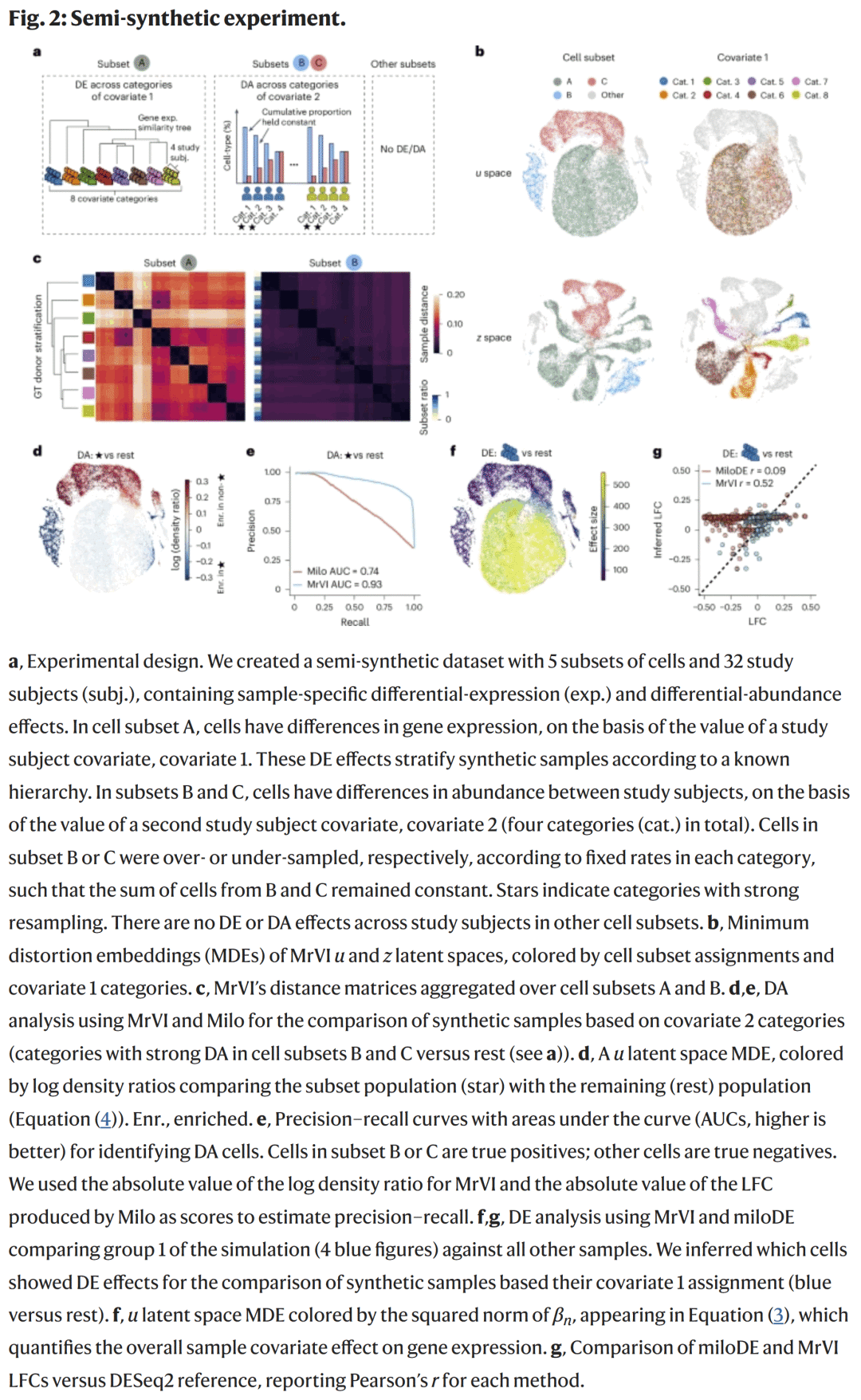 研究人员首先在模拟的外周血单核细胞(PBMC)数据上验证MrVI的准确性。结果显示,MrVI能够在不同细胞亚群中同时识别DE与DA效应,并正确重建样本间的层级关系。与传统基于聚类的分析相比,MrVI在无注释条件下获得了更高的识别精度与召回率。
