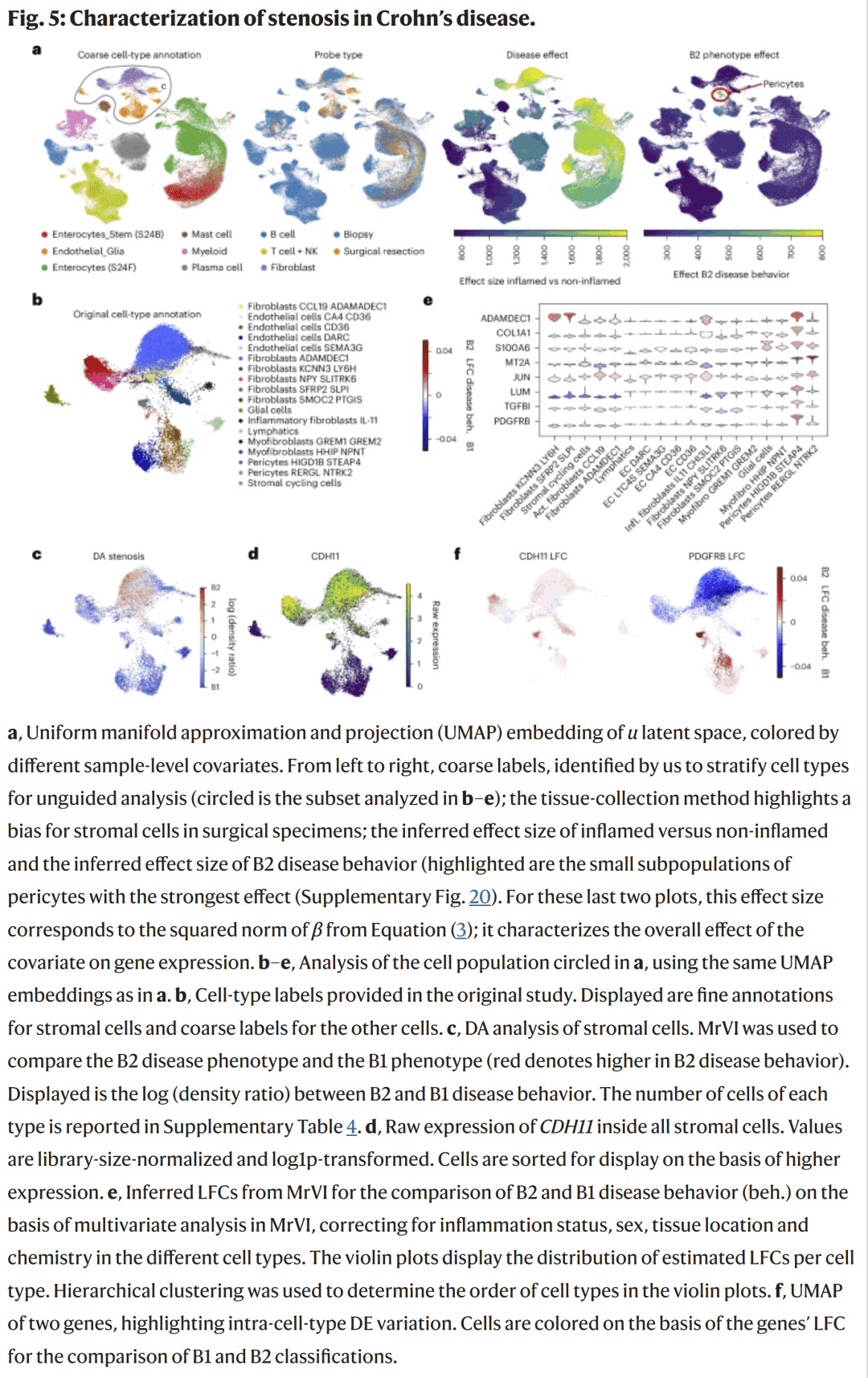 在分析46例Crohn’s患者和25名对照者的单细胞RNA测序数据时,MrVI揭示了与肠道狭窄(B2型病变)相关的间质细胞变化。模型发现: