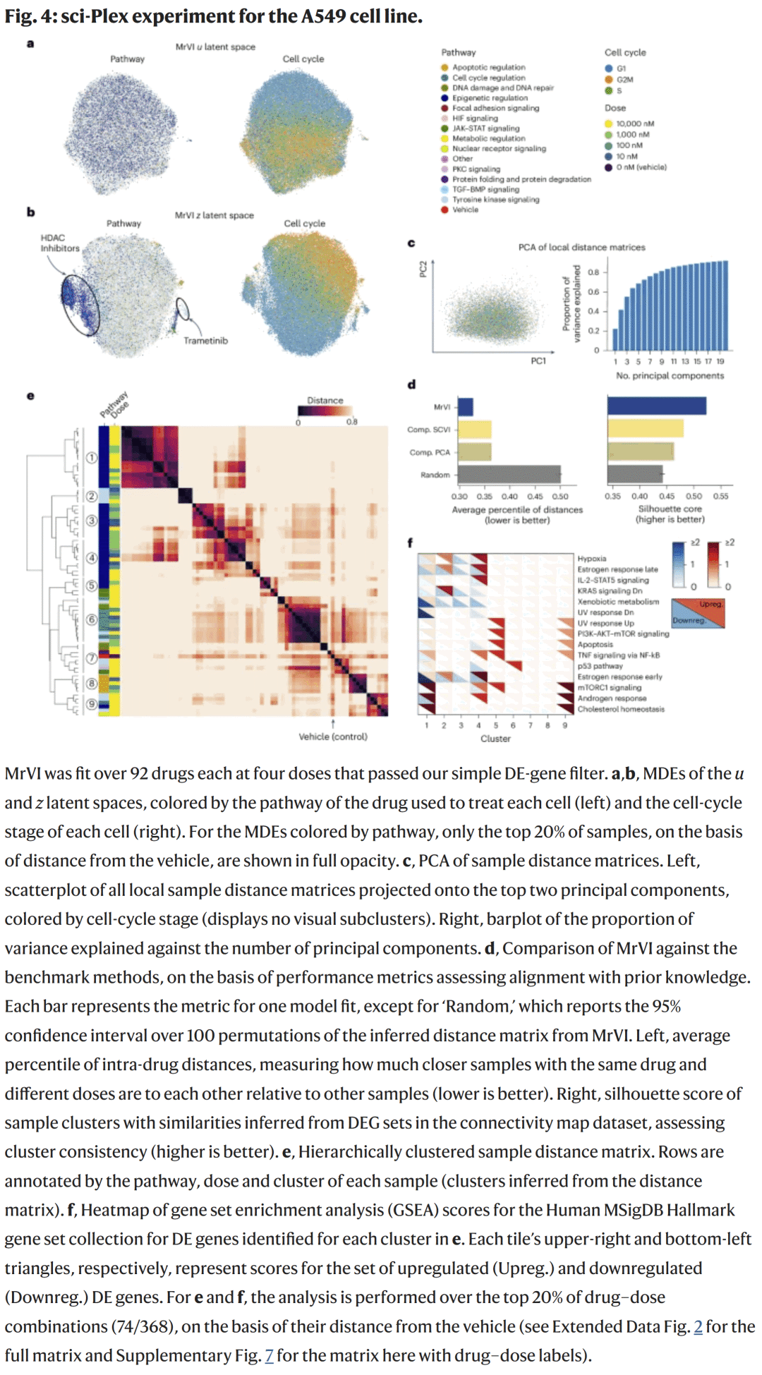 在sci-Plex单细胞药物筛选数据中,研究人员使用MrVI分析188种小分子化合物的转录组效应。模型在整合重复实验的同时,自动识别出具有相似机制的药物群。例如,HDAC抑制剂形成了独立簇,与代谢下调途径显著相关,而MEK抑制剂trametinib被正确聚类至RAS信号通路模块。