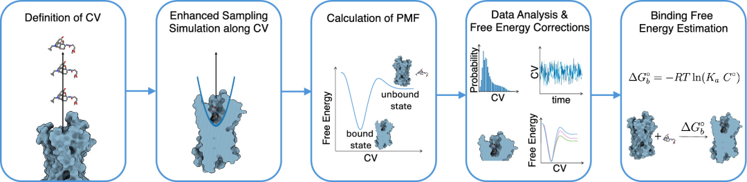 最新工作中,SMD结合PCV并基于Crooks涨落定理进行双向自由能估计,不仅提高了准确度,也能揭示详细的分子解离路径。SMD的优势在于易于并行化,可同时运行多个轨迹以加速收敛,并可与机器学习结合识别关键结合特征。
