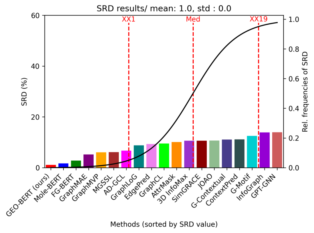 在基于8个公开数据集的基准测试中,GEO-BERT在多个数据集上均优于现有主流模型(如FG-BERT、MoleBERT),在AUC、F1-score、MCC等指标上表现突出。 研究引入了SRD(Sum of Ranking Differences)方法对模型性能进行综合评估,结果显示GEO-BERT在多个任务中排名稳定,表现优异,具备良好的一致性。